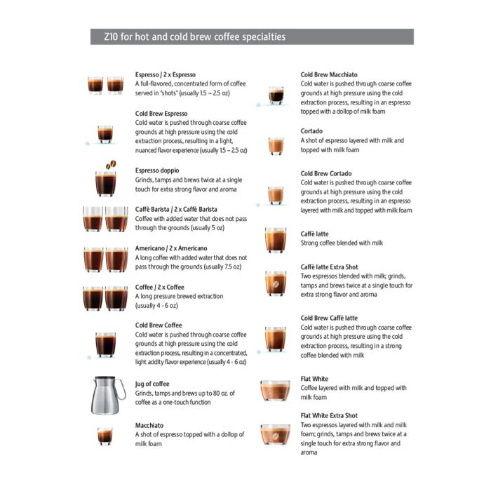• 32 specialties; brews hot and cold brew coffee specialties